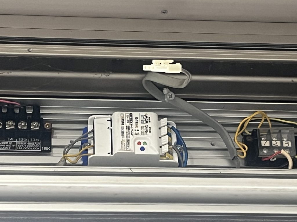 岐阜県 可児市 自動ドア修理 岐阜県可児市のお客様より自動ドアの修理依頼がありました。挟まれ防止センサーが壊れていた為、扉が閉まらなくなってしまっていた為、挟まれ防止センサーの交換です。 挟まれ防止センサーを外した跡、配線と外した受信器です。 取替したものです。ちゃんと閉まるようになりました。 前へ 一覧へ 次へ